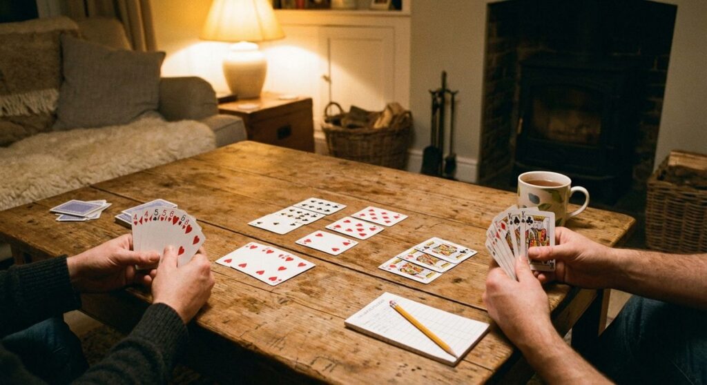Variante à 2 joueurs très populaire. Chaque joueur reçoit 10 cartes. Il n’y a pas de pose sur la table : vous gardez vos combinaisons en main et annoncez « Gin » quand toutes vos cartes forment des combinaisons, ou « Knock » quand vos cartes inutilisées totalisent 10 points ou moins. L’adversaire peut alors « accrocher » ses cartes inutilisées aux combinaisons du knockeur.